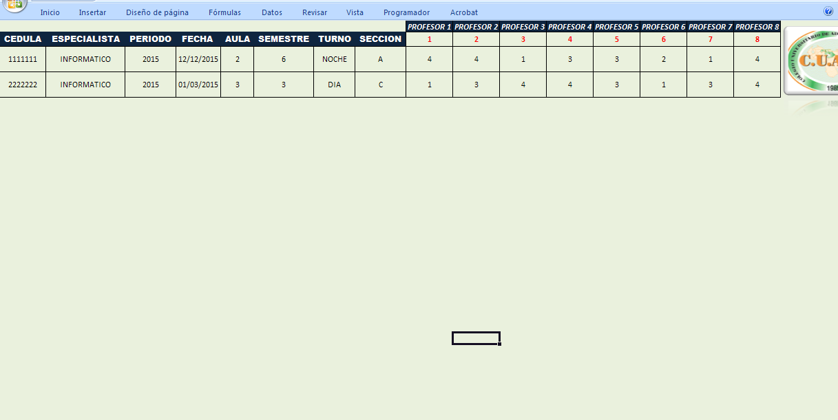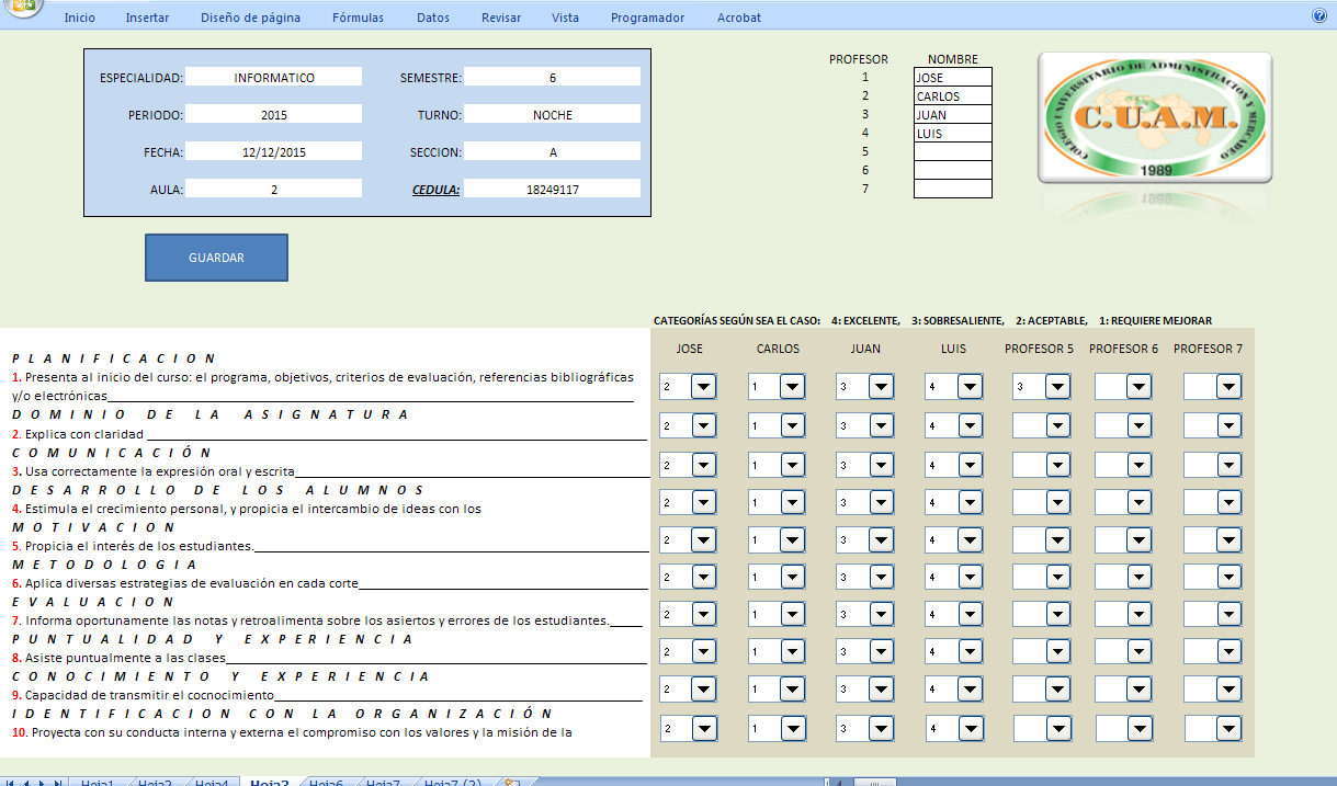 SISTEMA DE CALIFICACION A PROFESORES, POR SU PLANIFICACION, DOMINIO DE LA MATERIA, COMUNICACION, DESARROLLO CON LOS ALUMNOS, MOTIVACION, METODOLOGIA, EVALUACION, PUNTUALIDAD, CONOCIMIENTO Y EXPERIENCIA, TODO ESTO EN ABSE A UN RANGO DE CALIFICAION DEL 1 AL 4 QUE VA DESDE: REQUIERE MEJORAR HASTA EXCELENTE, DONDE SE GUARDAN EL NOMBRE DLE PROFESOR EVALUADO Y FORMULARIO CON LOS DATOS DEL ALUMNO PARA SABER QUIEN EVALUO A QUIEN.